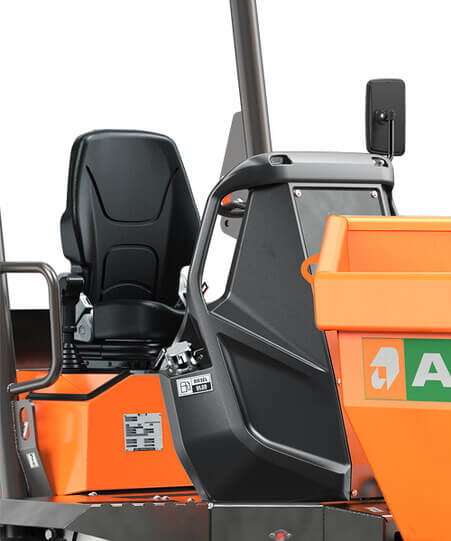 De rijpositie is uitgerust met een stoel met een aanwezigheidssensor en een veiligheidsgordel met een gespsensor, om te voorkomen dat de machine wordt gestart als de aanbevolen veiligheidsmaatregelen niet zijn genomen en om onbedoelde beweging ervan te voorkomen. Bovendien is het uitgerust met een elektronische negatieve rem, die automatisch wordt ingeschakeld wanneer de motor van de dumper wordt uitgeschakeld om elke beweging te voorkomen.